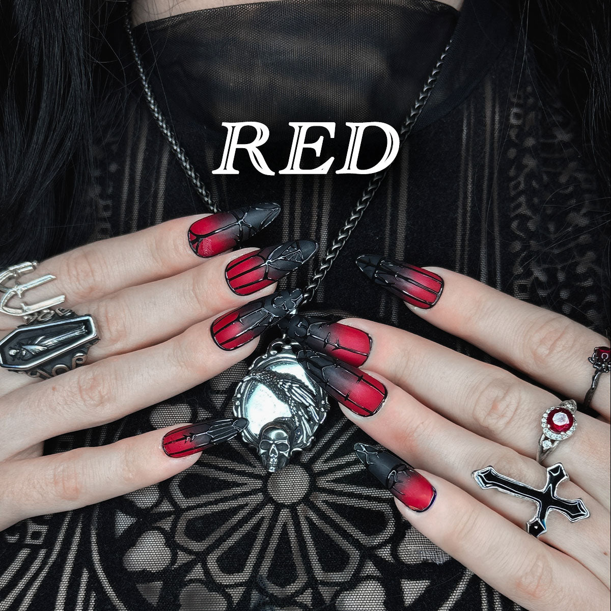 Crimson Thorn Heart Press-On Nails – Red Roses & Black Gothic Fake Nails